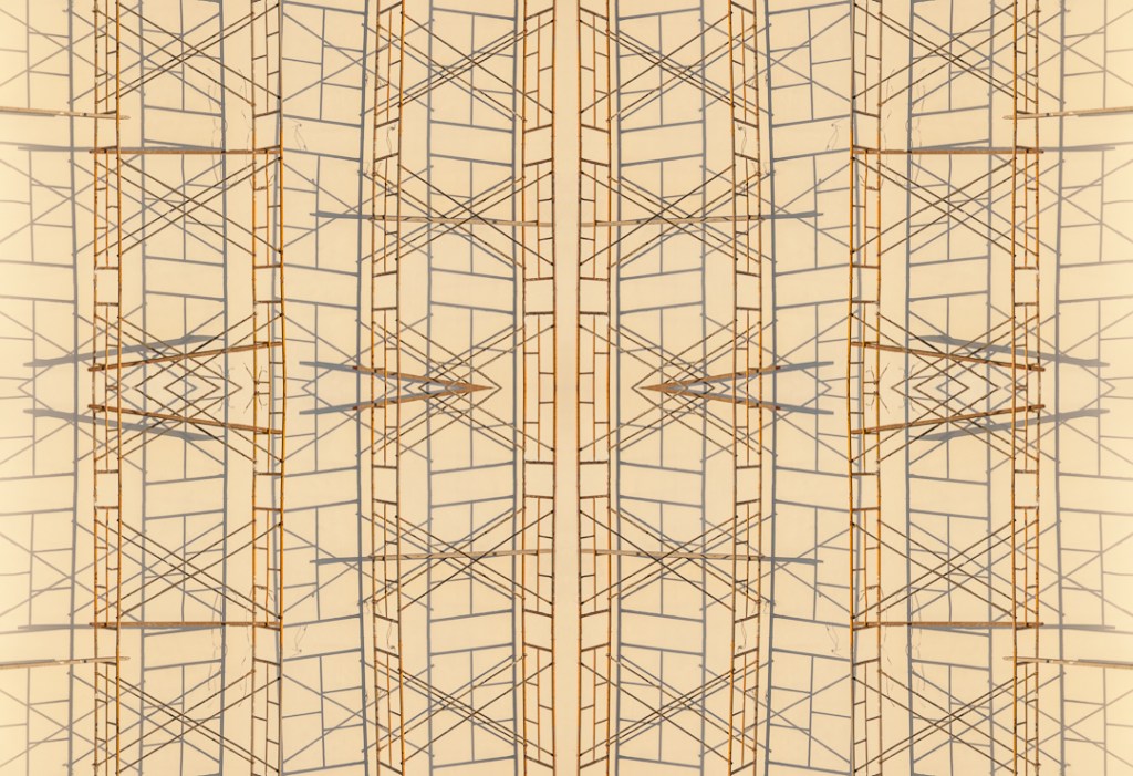 Scaffolding rhythms: early morning. Photo of building scaffolding, Royal Haciendas resort, Playa del Carmen, Mexico.