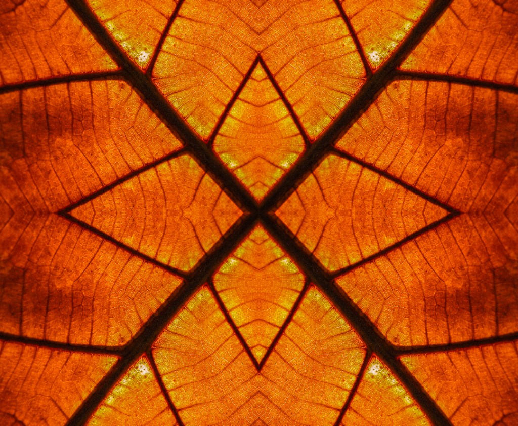 Autumn leaf: stained glass. Photo of back-lit leaf, Essex woods, Massachusetts.