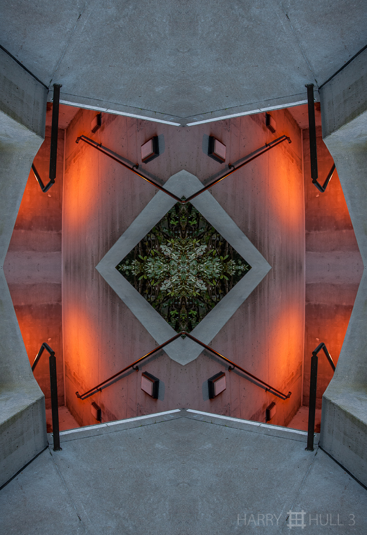 Emergency exit: version 2. Photo of exterior stairwell to basement, Grace Cathedral, San Francisco, California.