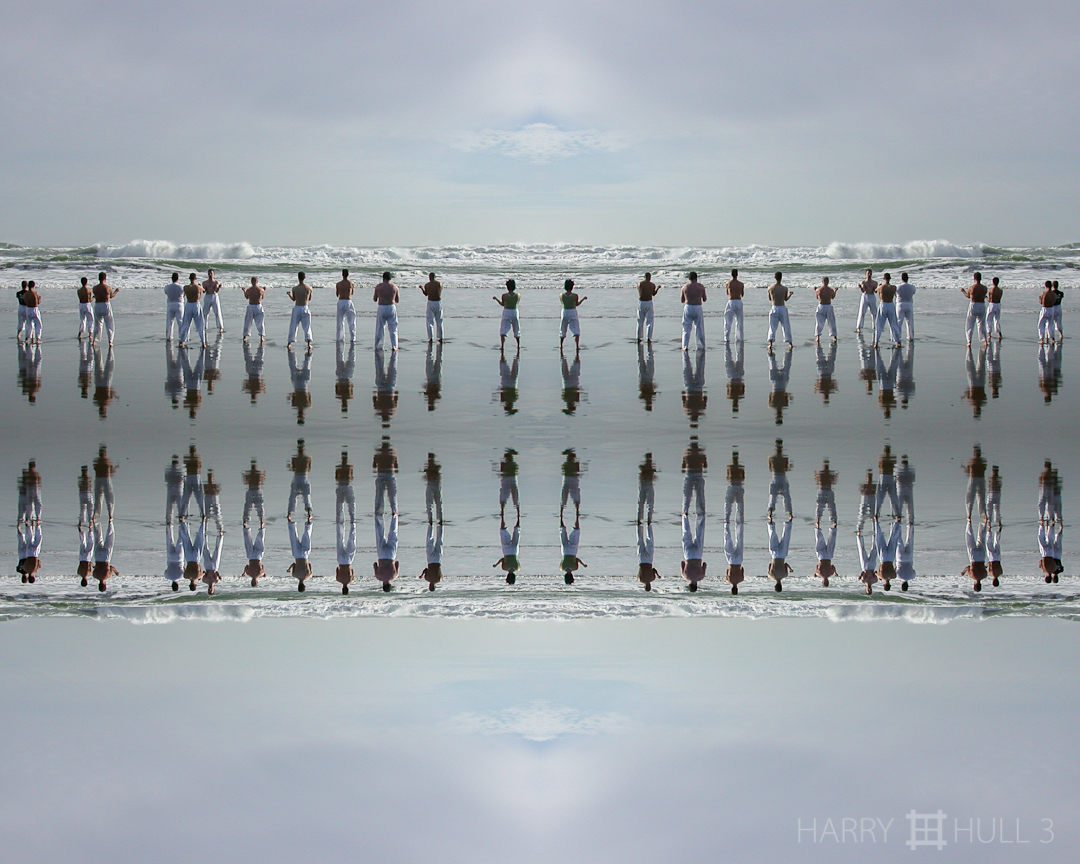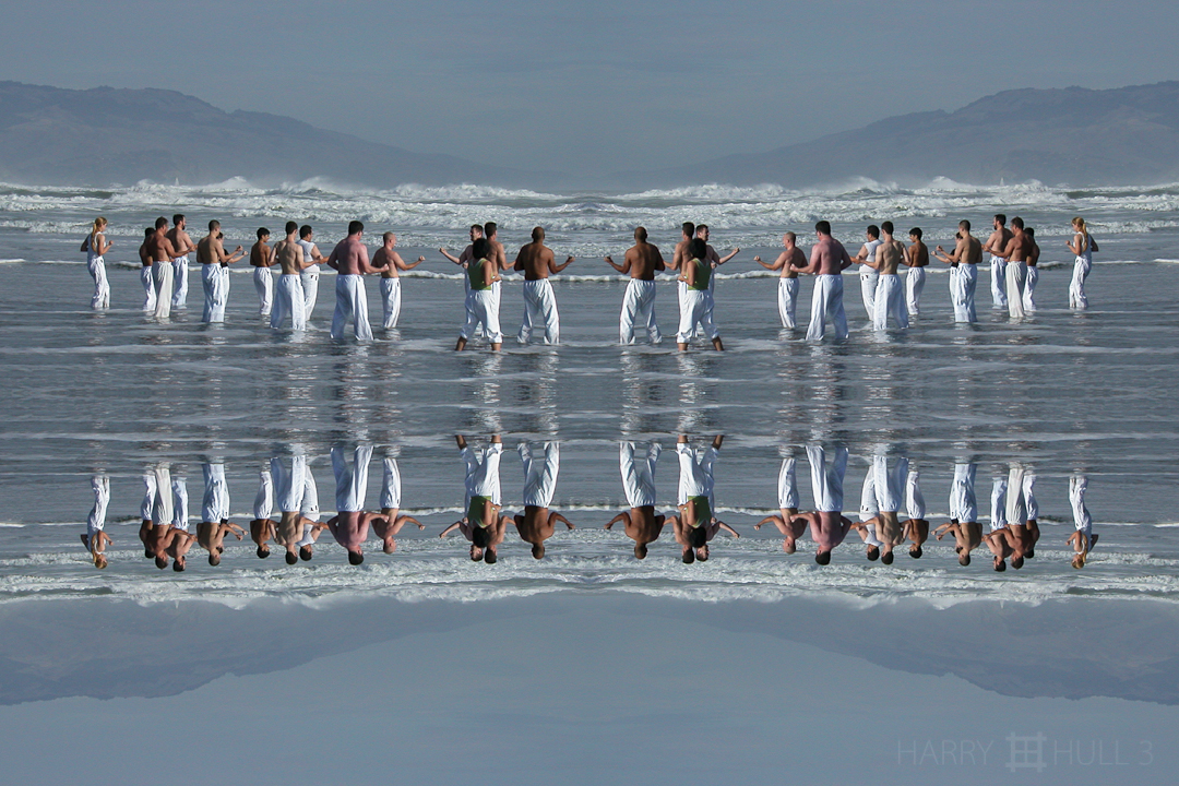 Tai chi on the beach: view 1. Photo of tai chi practitioners on New Year’s Day, Ocean Beach, San Francisco, California.