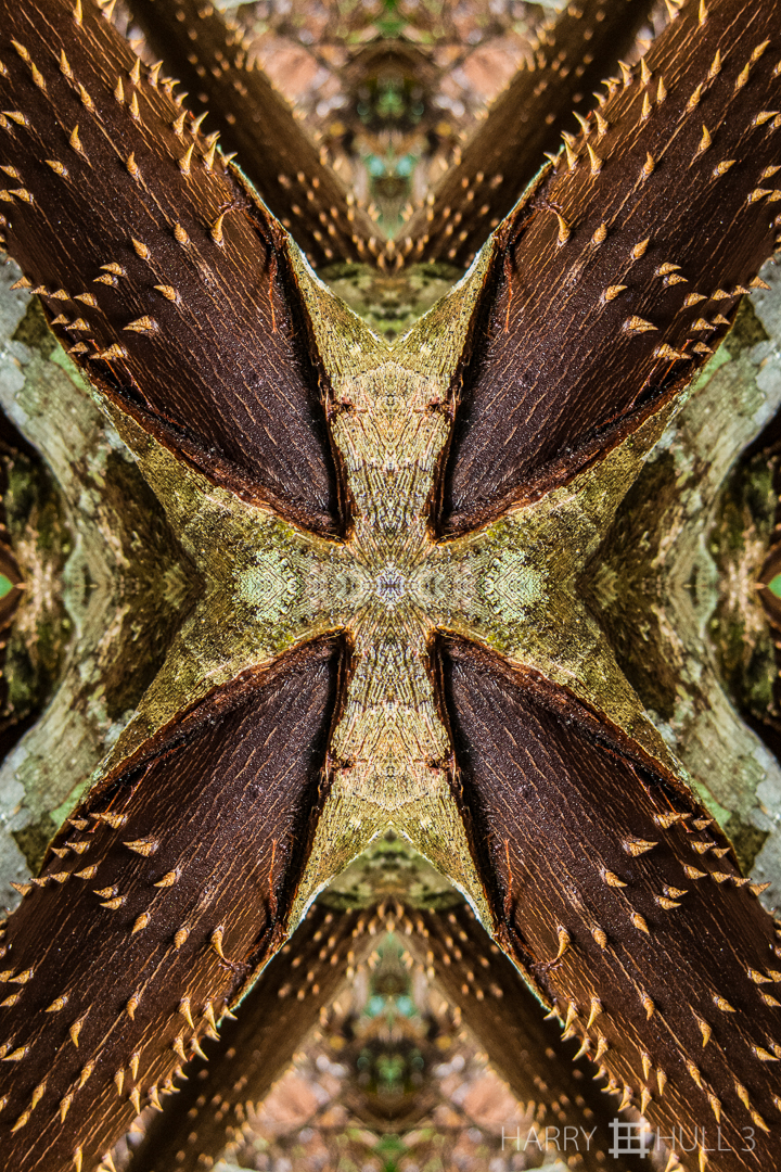 Cross of thorns. Photo close-up of thorny root growing from trunk of walking palm in forest, Lapa Rios, Osa Peninsula, Costa Rica.
