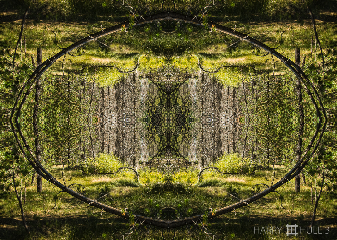 Forest portal. Photo of half-fallen tree, meadow, and forest beyond, Lassen Volcanic National Park, California.