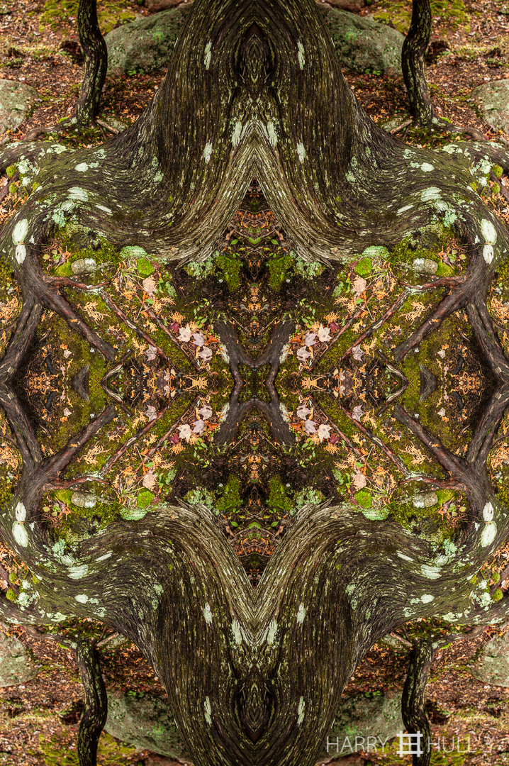 Tree spider. Photo of tree trunk and roots in forest near Jordan Pond, Acadia National Park, Maine.