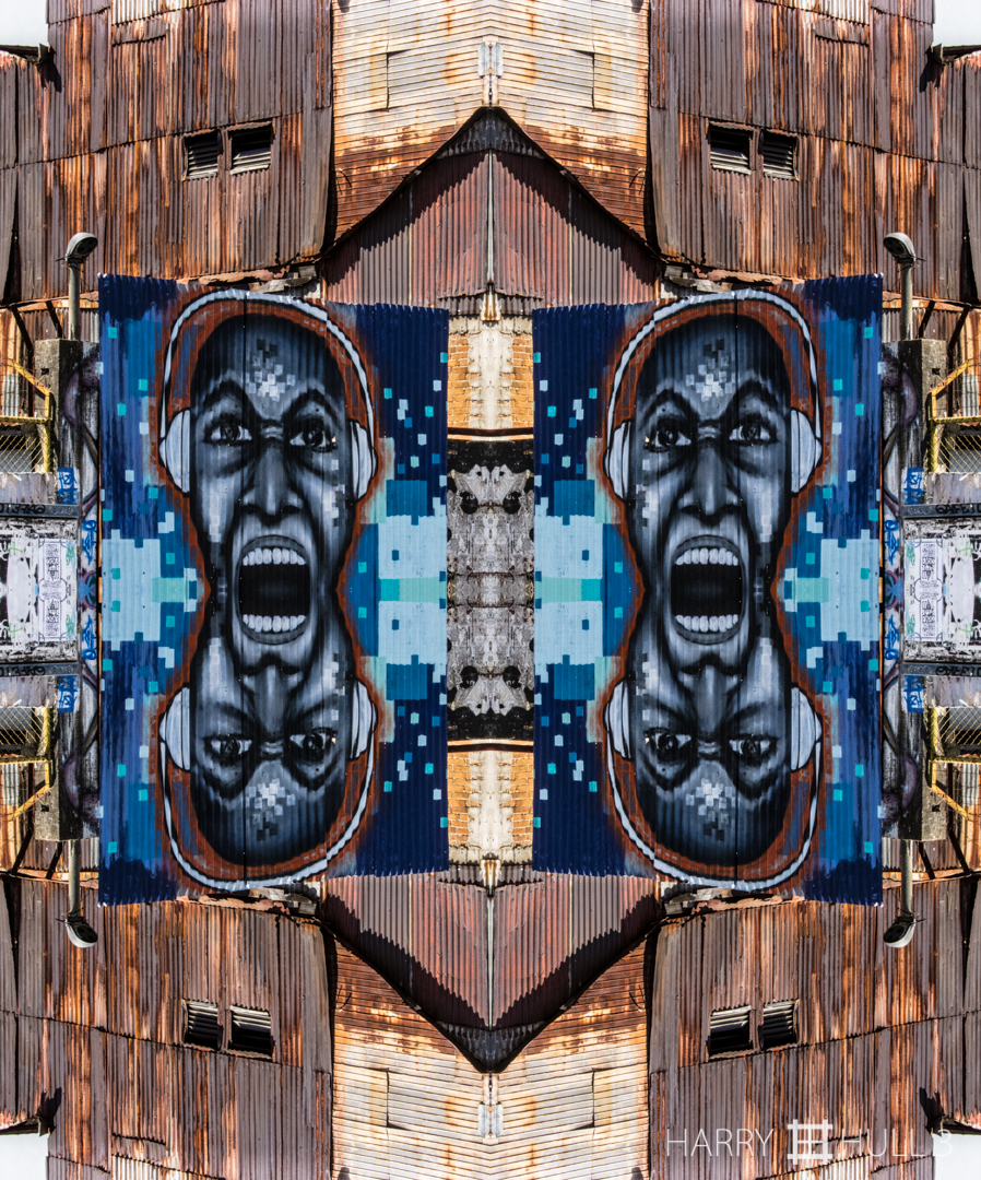 Urban scream. Photo of graffiti on corrugated metal facade of industrial buildings, San Jose, Costa Rica.