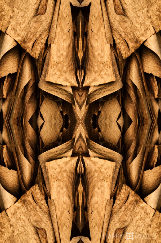 Hidden masks. Photo close-up of dry banana fronds, Finca Cantaros, San Vito, Costa Rica.