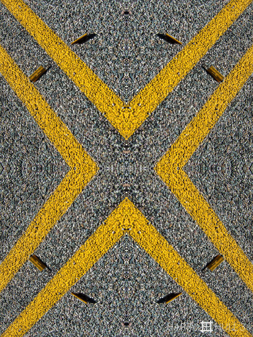Road crossing. Photo close-up of double-lines and reflectors in the middle of the road, Sangre de Cristo Mountains near Santa Fe, New Mexico.