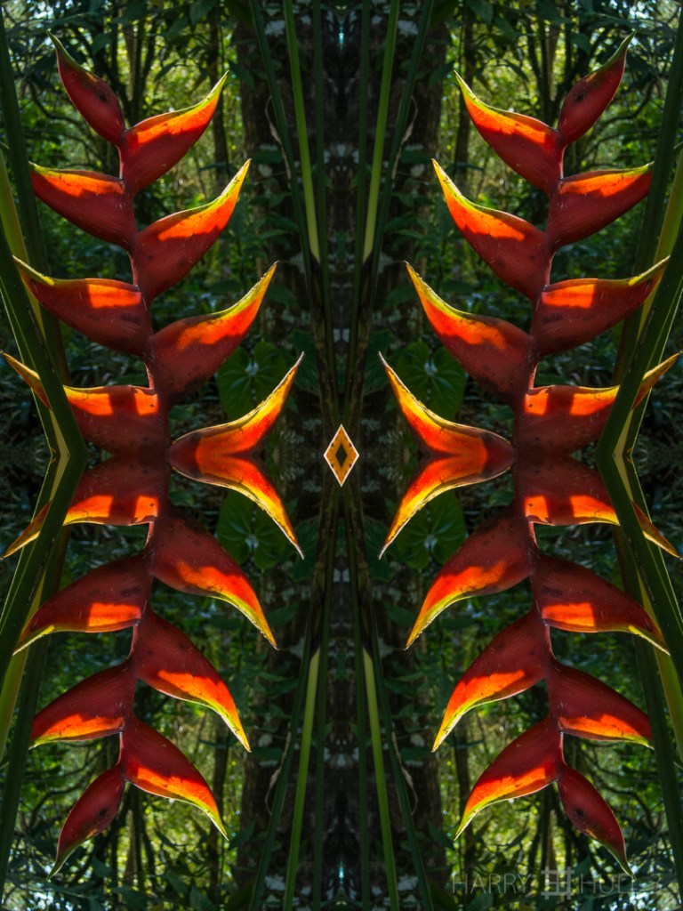 Forest surprise. Photo of heliconia bracts caught by early morning sun in the forest, Finca Cantaros, San Vito, Costa Rica.