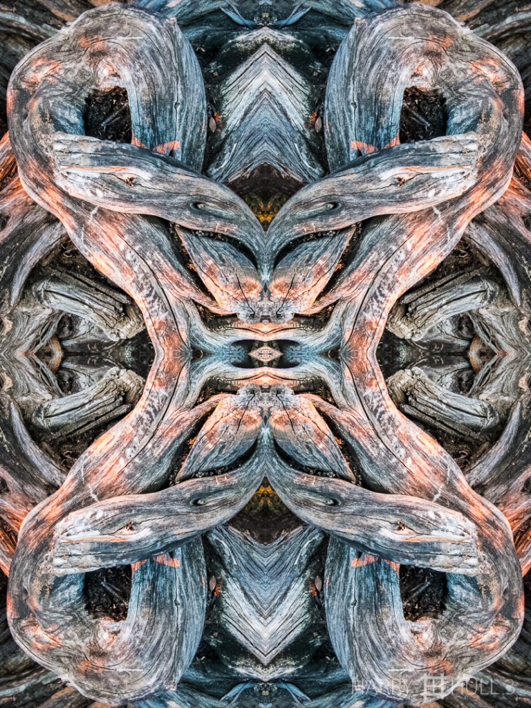 Contortions. Photo of twisted trunk and branches of trees along the cliff walk, Santa Monica, California, at sunset.