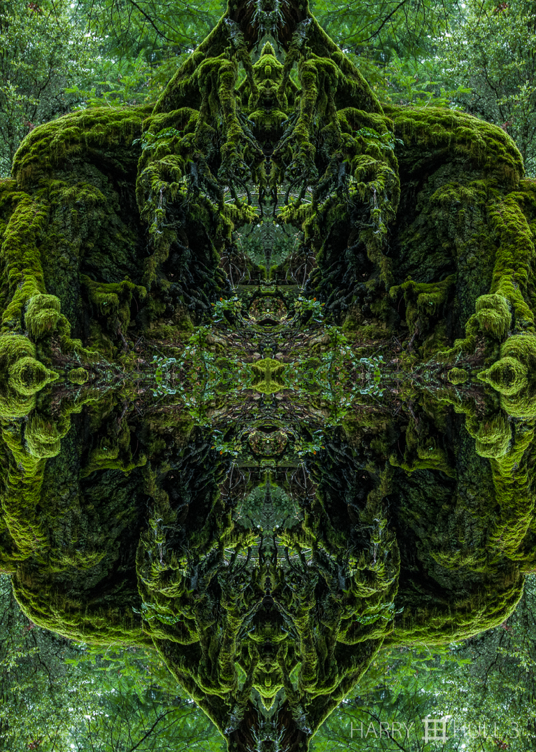 Forest guardian. Photo of moss-covered tree stump in the forest of Mount Tamalpais State Park, California.