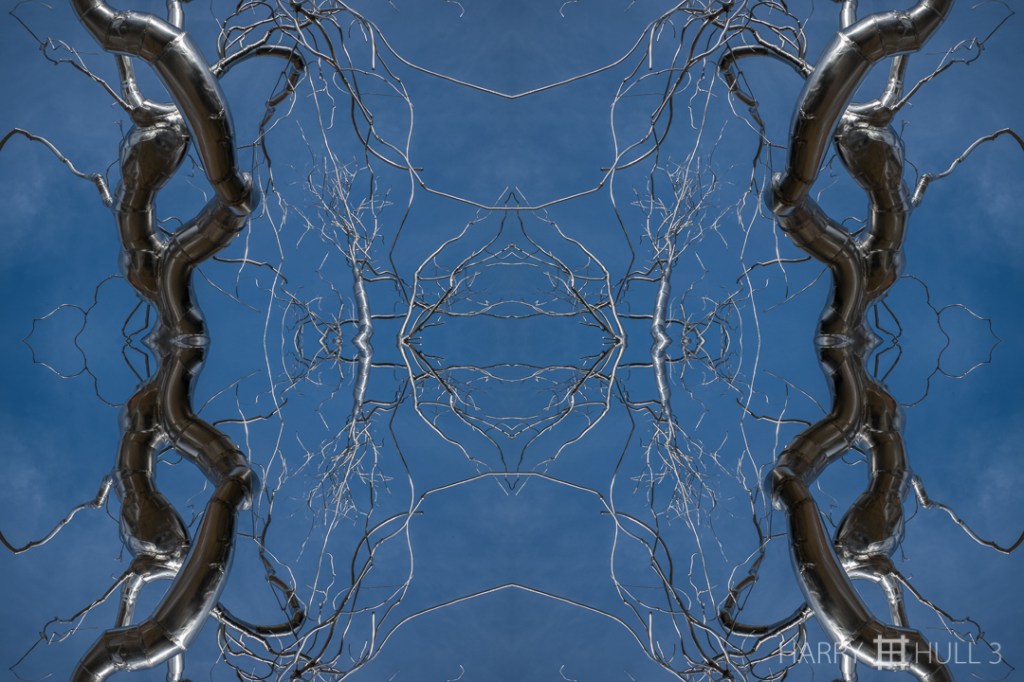 Steel tree. Photo of branches of “Graft”, a sculpture by Roxie Paine in the Sculpture Garden of the National Gallery of Art, Washington DC.