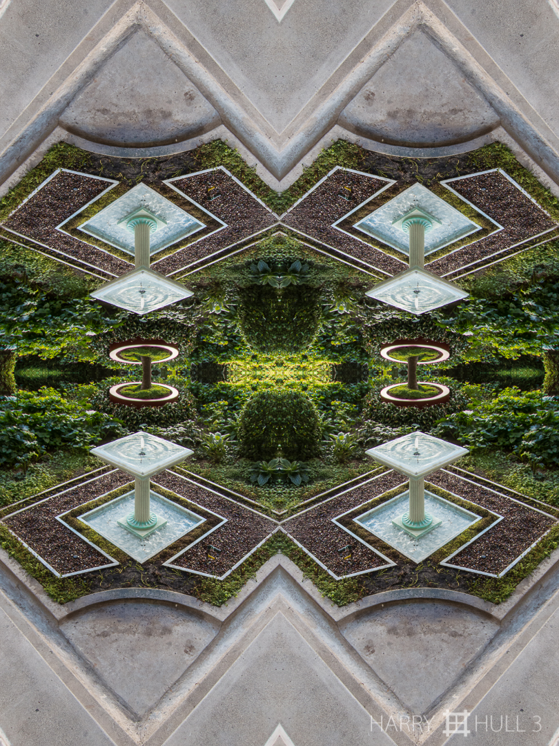 Four fountains. Photo of inner courtyard and gardens of the Getty Villa, Pacific Palisades, California.