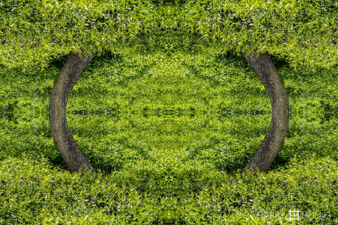 Tree ring. Photo of tree trunk in planted foliage, Getty Center, Los Angeles, California.