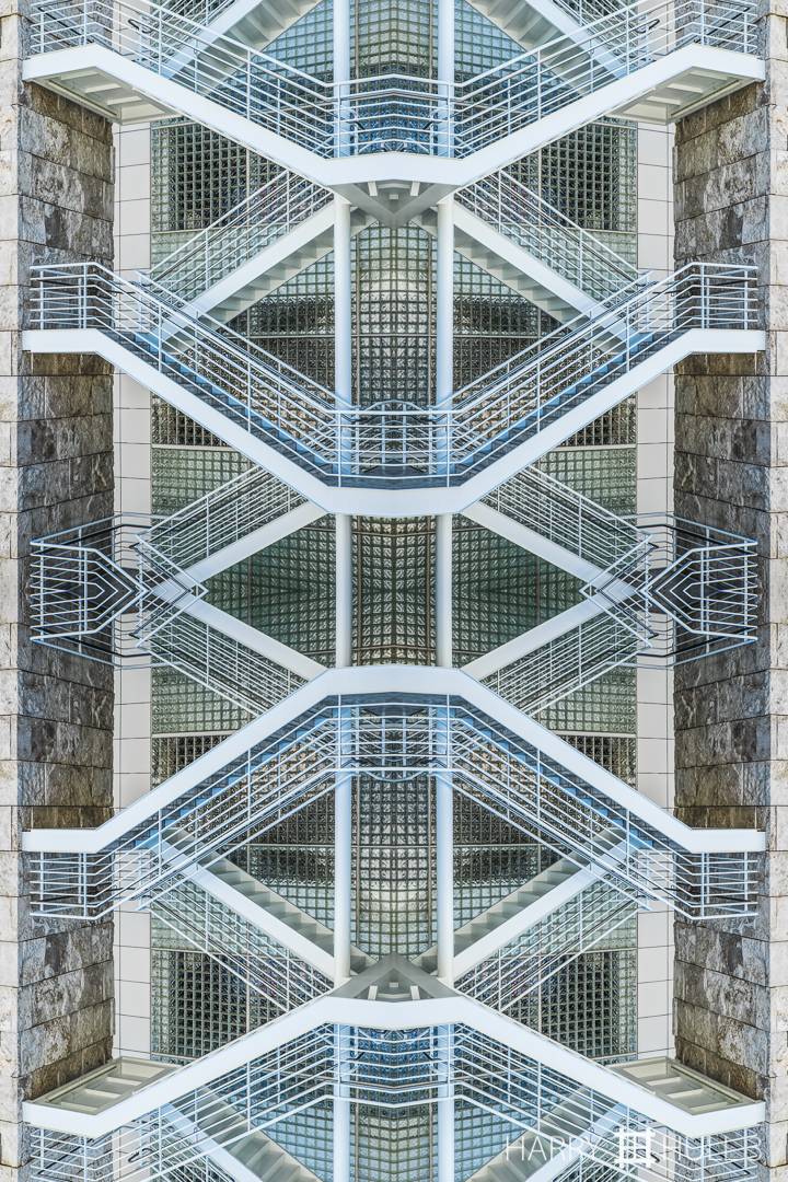 Escape architecture. Photo of external stairs and fire escape on a building at the Getty Center, Los Angeles, California.