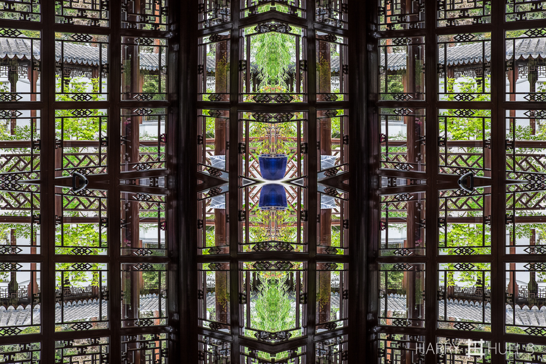 Blue pot. Photo of Chinese gardens from inside one of the tea house pavilions, Huntington Gardens, San Marino, California.