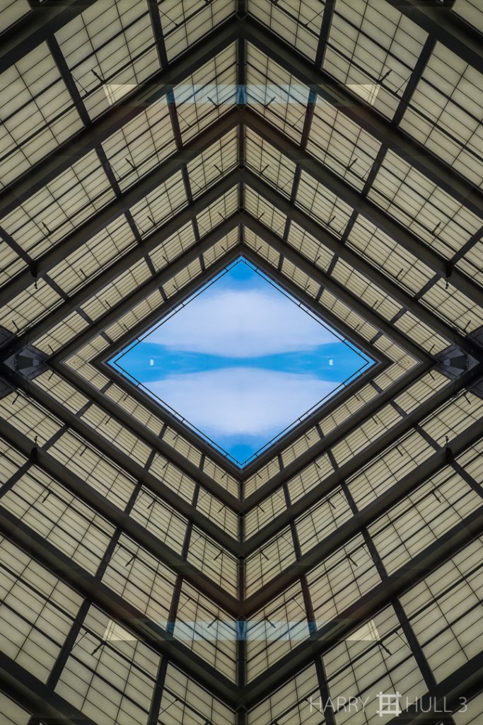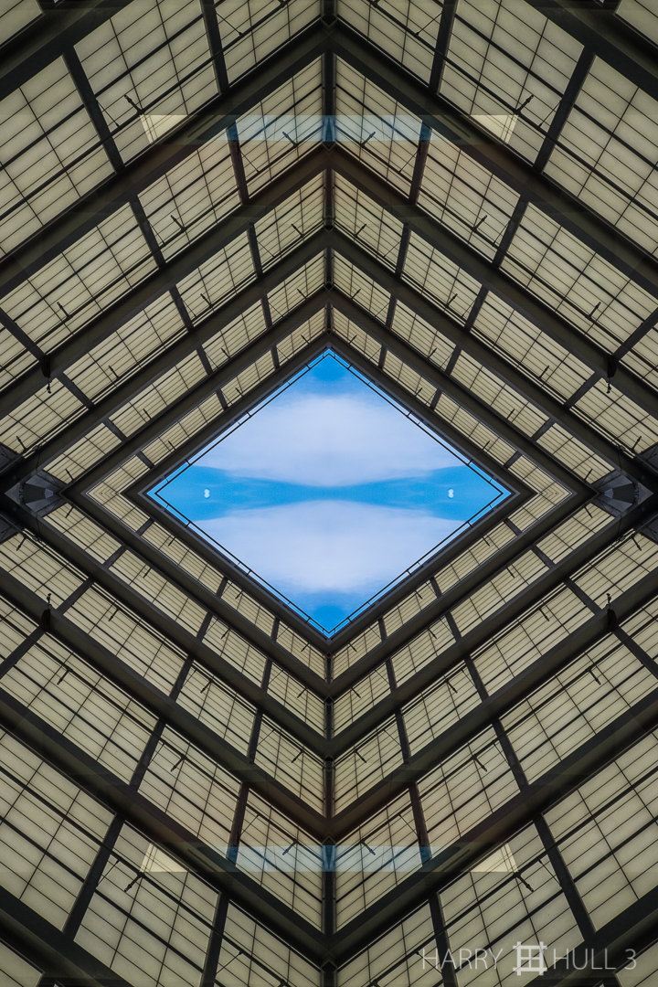 Sky opening. Photo of part of an interior ceiling in one of the buildings of the Los Angeles County Museum of Art, Los Angeles, California.