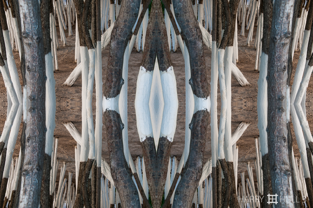 Crowd of trees. Photo of tree trunks painted white near a street in Playa del Carmen, Mexico.
