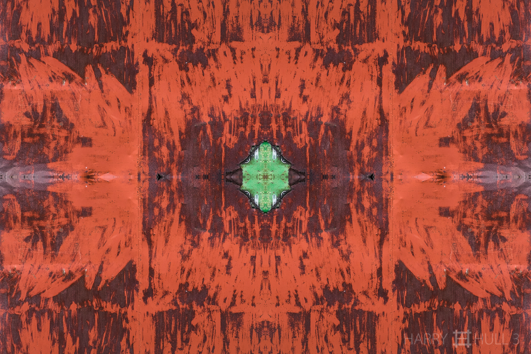 The green beneath. Photo of weathered metal door on a storage shed, with older green door surface showing in a corner, Cerro Punta, Panama.