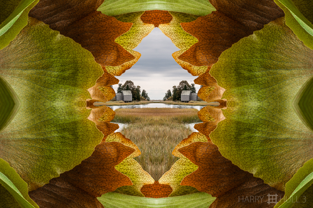 Marsh view. Photo composite: mandalagraph of a Staghorn fern in Copey de Dota, Costa Rica, with a mirror-image of a salt water marsh on Cape Cod, Massachusetts.