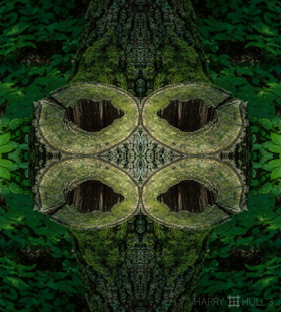 Four-holer. Photo of a tree stump in a forest, Magnolia, Massachusetts.