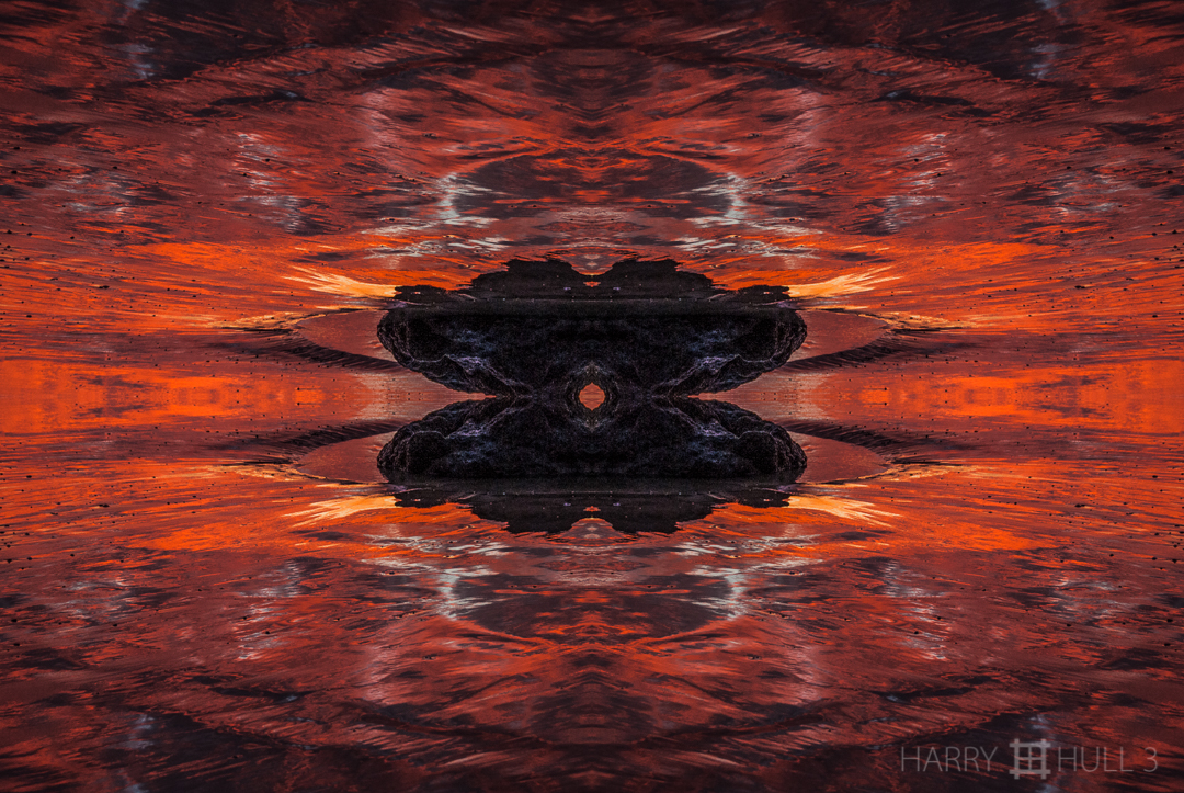 Fire water. Photo of sunset refected in wet sand with rock, Playa Tamarindo, Costa Rica.