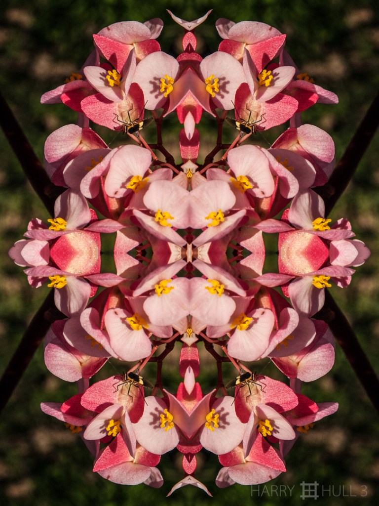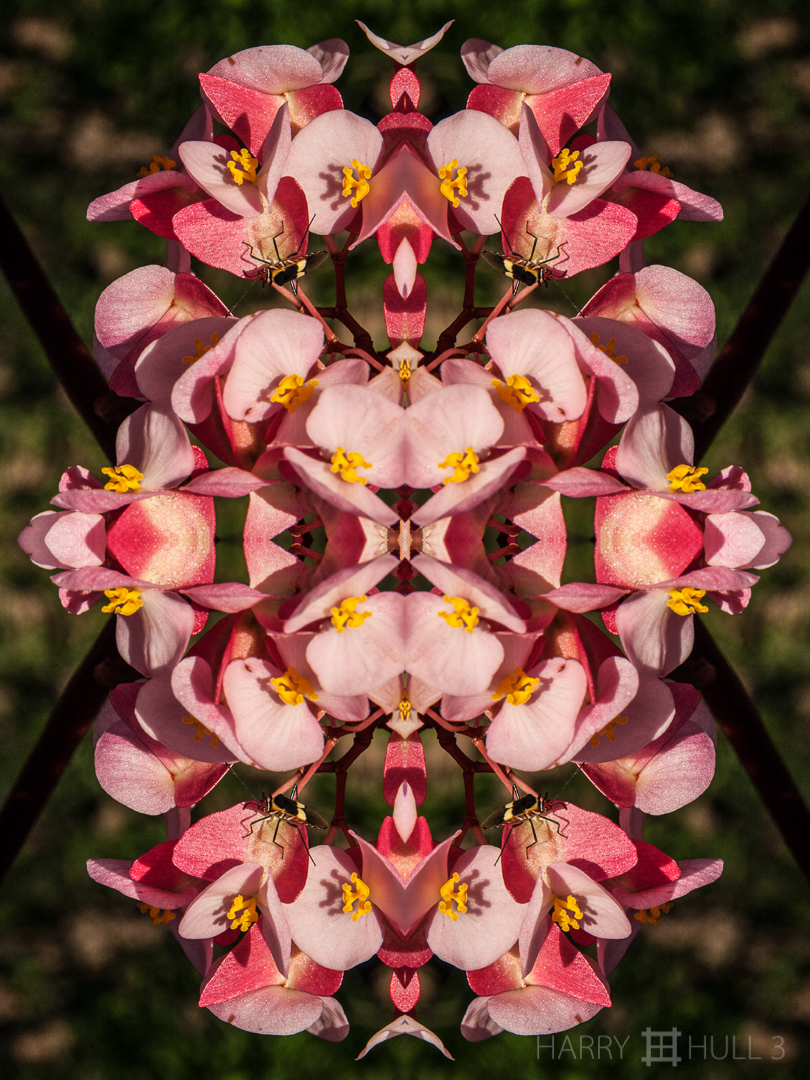 Begonia with bug. Photo of a flowering Begonia with a Coreid bug (Hypselonotus atratus), Finca Cantaros, San Vito, Costa Rica.
