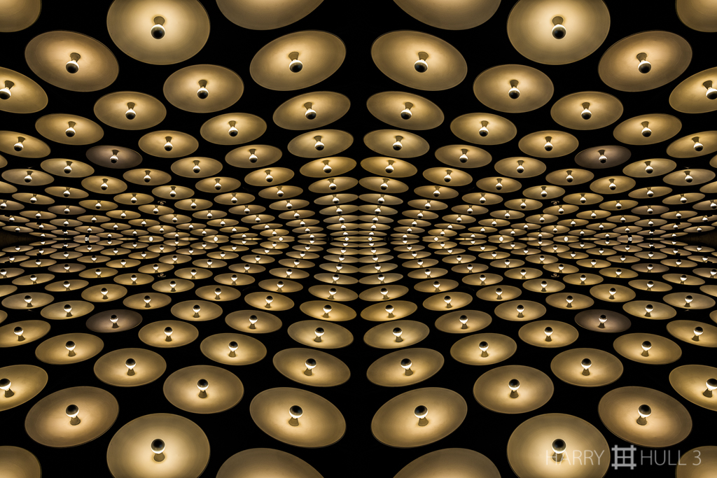 Bulb swarm. Photo of ceiling lights in the main reception area of the Met Breuer building, part of the Metropolitan Museum of Art, New York, New York.