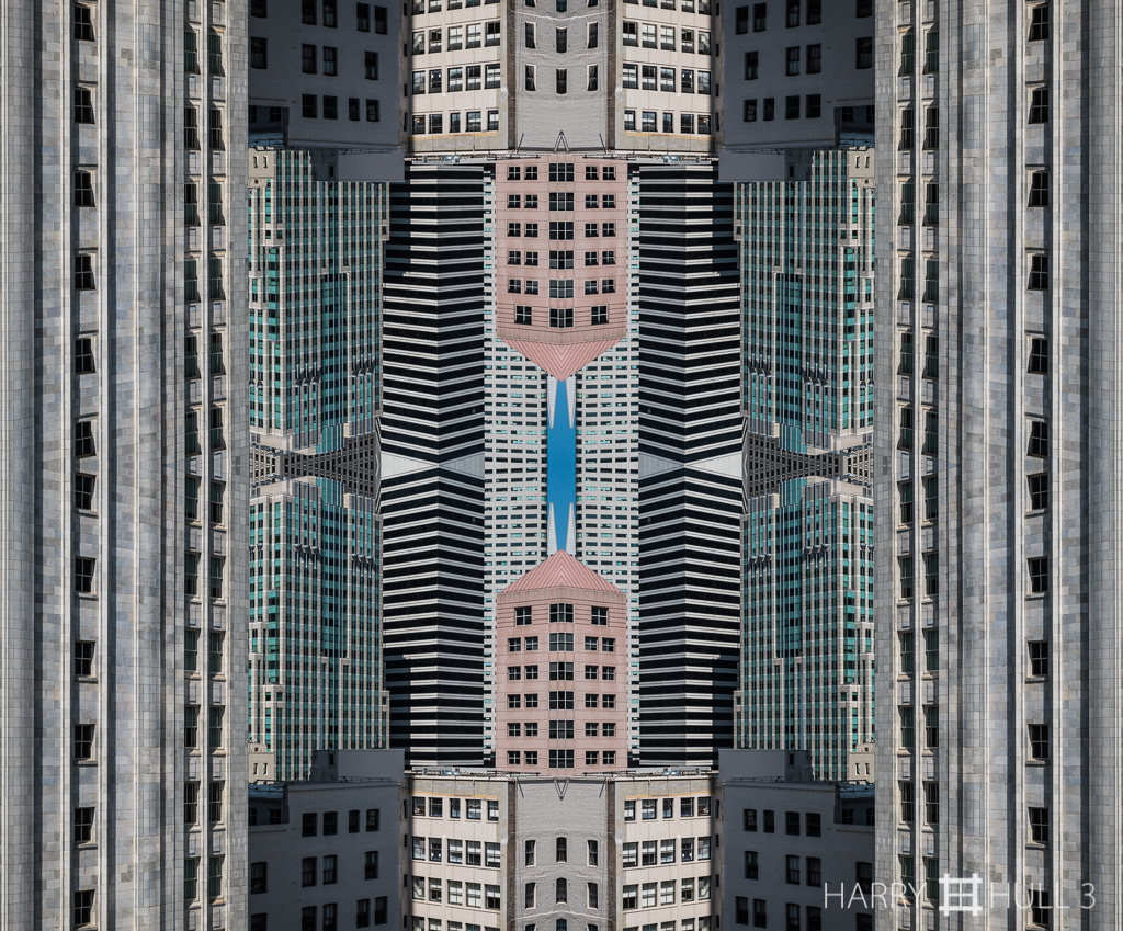 Hidden pyramids. Photo of office buildings in downtown San Francisco with the Transamerica Building in the very center, taken from the San Francisco Museum of Modern Art seventh floor balcony, San Francisco, California.