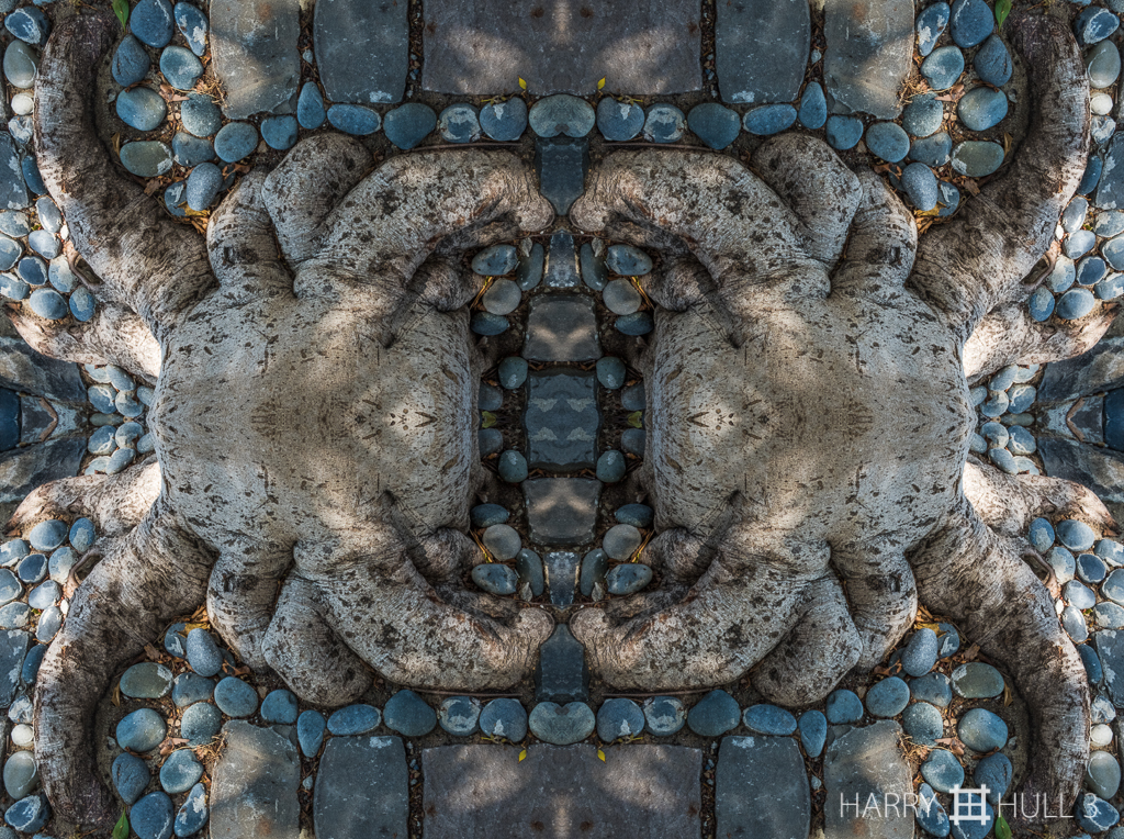 Rock crabs? Photo of tree roots and a street tree basin filled with decorative stones, San Francisco, California.