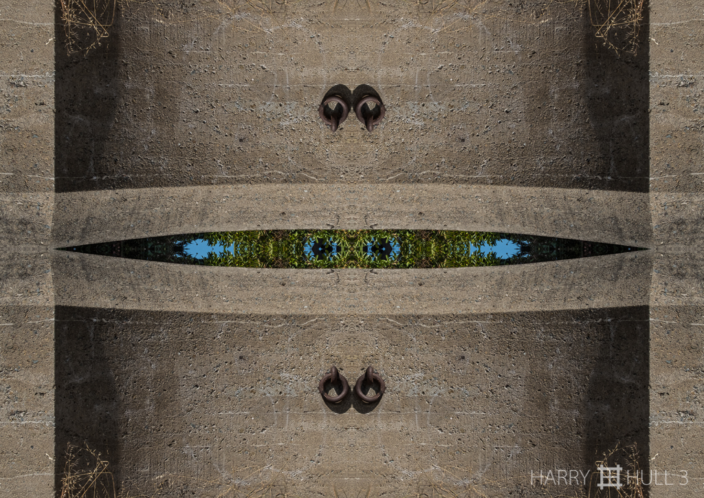 Nature under pressure. Photo of a concrete wall and metal rings that are part of an old ammunition bunker, Fort Mason, San Francisco, California.