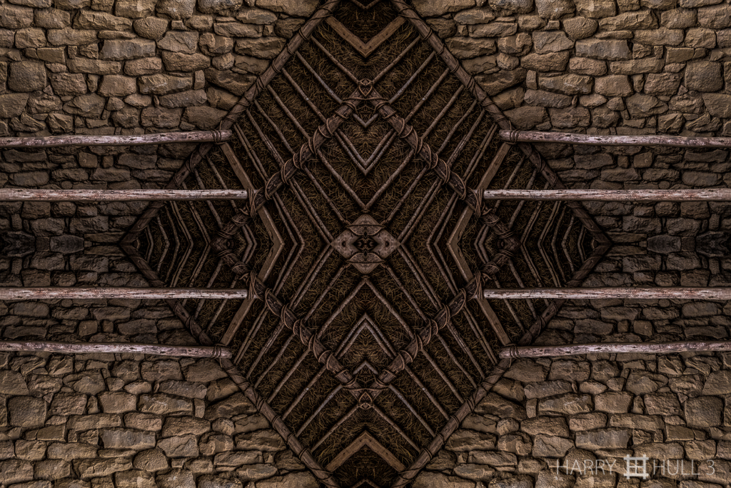 Thatch work. Photo of stone wall and underside of the thatched roof of a reconstructed Inca building near the trail entrance to Huayna Picchu, Machu Picchu, Peru.