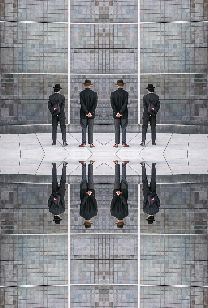 Homage to Rene Magritte? Photo of two men,Yerba Buena Gardens, San Francisco, California.